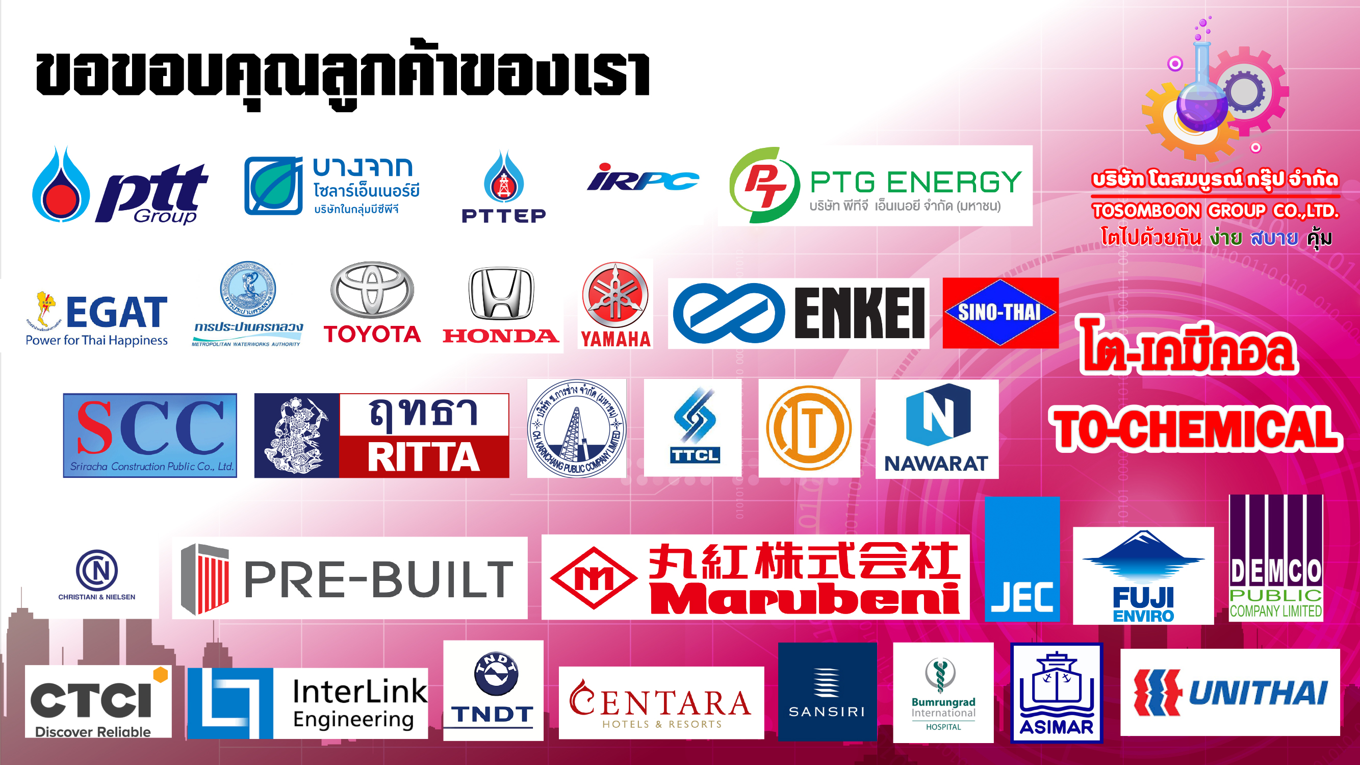 โตเคมีคอล (TO-CHEMICAL) ขอขอบพระคุณลูกค้าทุกท่านที่ให้โอกาส ได้เป็นเคมีที่ตรงกันในส่วนหนึ่งของชีวิตของคุณ